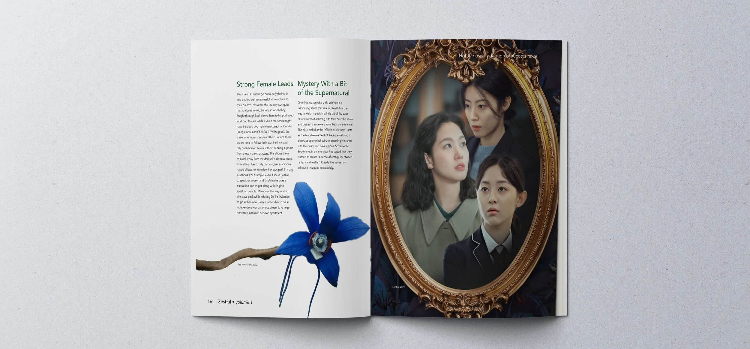 This was a project for Typography 2. We were supposed to differentiate each article and spreads with different amount of text: 40%, 50%, and 60%. A good hierarchy in typography, unique headers, and a unique table of contents page were also needed.